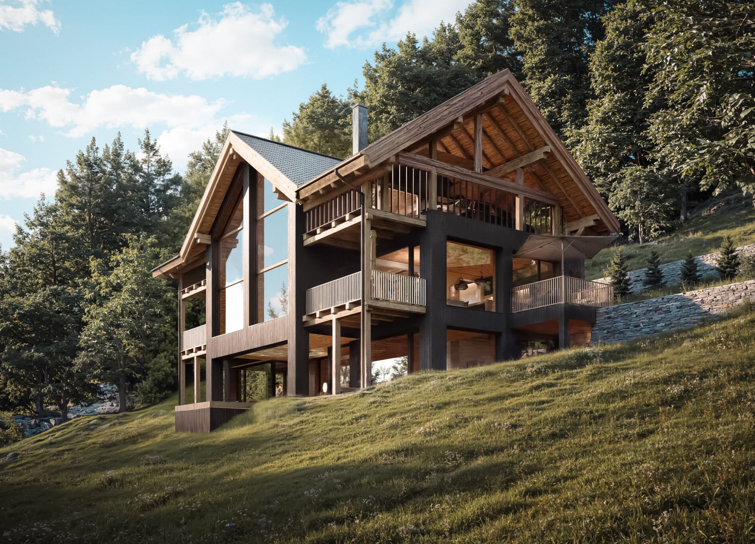 As soon as you enter the chalet, the room opens up in all its spaciousness. Large panoramic windows bring nature inside and allow indoor and outdoor spaces to merge.